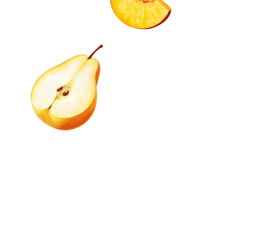 Взбитая творожная основа (творог, сливки, йогурт, сахар, стабилизаторы (модифицированный крахмал, гуаровая камедь, тары камедь), желатин), фруктовый наполнитель (вода, сахар, персик, груша, стабилизаторы (модифицированный крахмал, гуаровая камедь, ксантановая камедь), ароматизатор, регулятор кислотности – лимонная кислота).